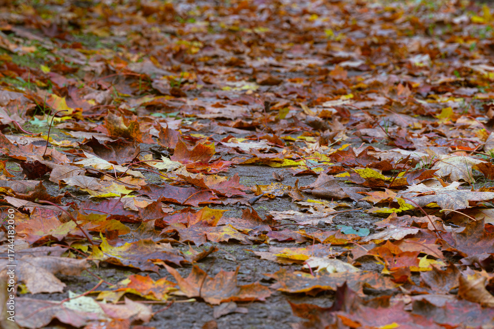 Colorful autumn maple leaves covering the ground in a forest path, natural fall background with warm orange and yellow tones, seasonal nature texture