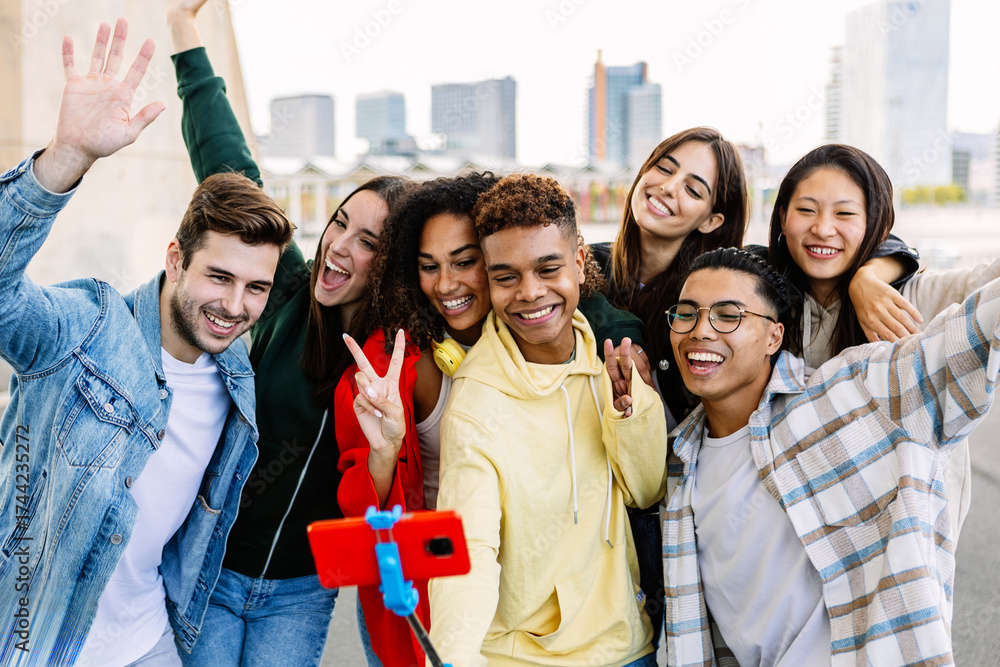 Multi-ethnic group of young students taking a selfie with a selfie stick, smiling and having fun together outdoors