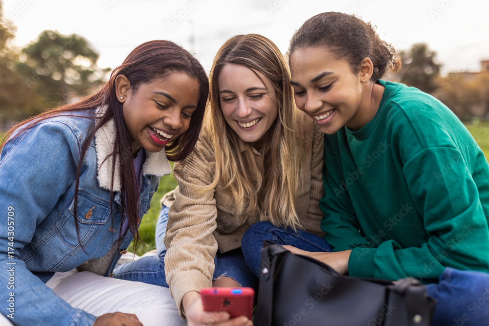 Three diverse young happy student women having fun using mobile phone at college campus. Friendship, technology and youth community concept