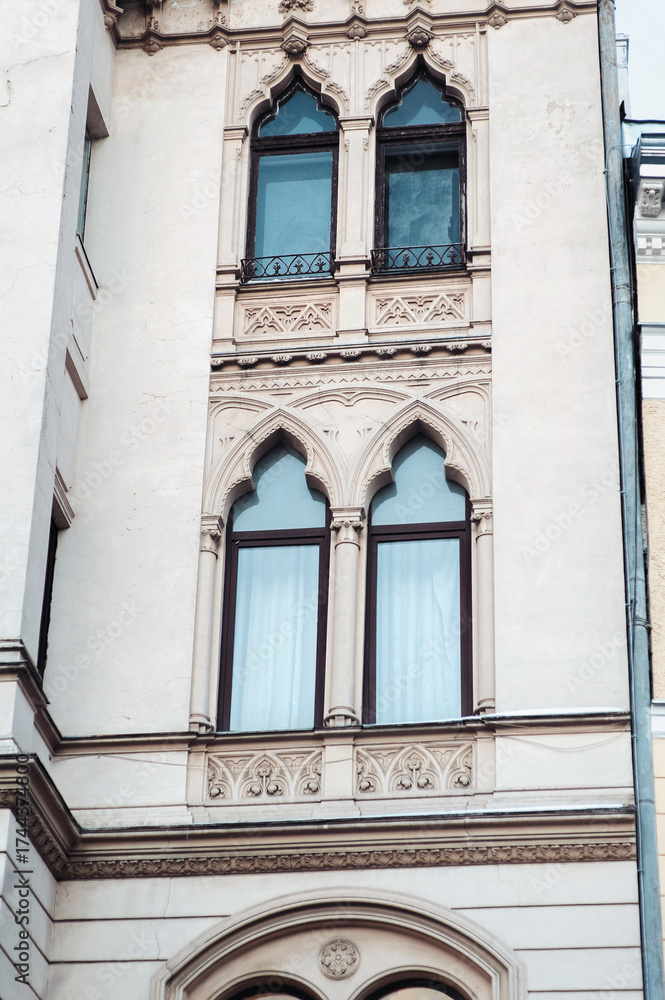 Four old ornate windows on the white faзade of a neoclassical building with oriental relief motifs, capitals, and decorative elements. Lviv, Ukraine.