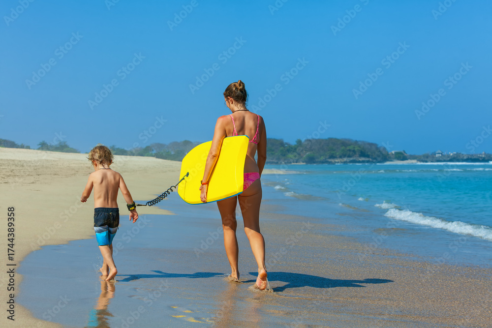 Back view of young woman, little surfer child walking along sea sand beach with bodyboard. Summer adventures, active families, parents and kids lifestyle, sports activities on school holiday with kids