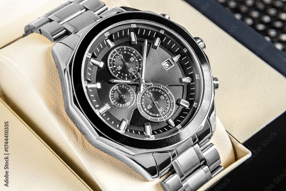 Modern men’s wristwatch with black dial, gray stainless steel bracelet and elegant timeless design