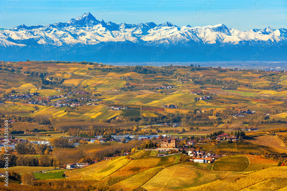 Aerial view of the Langhe hills with autumnal vineyards and the snow-capped mountains in the background, in Piedmont, Italy.