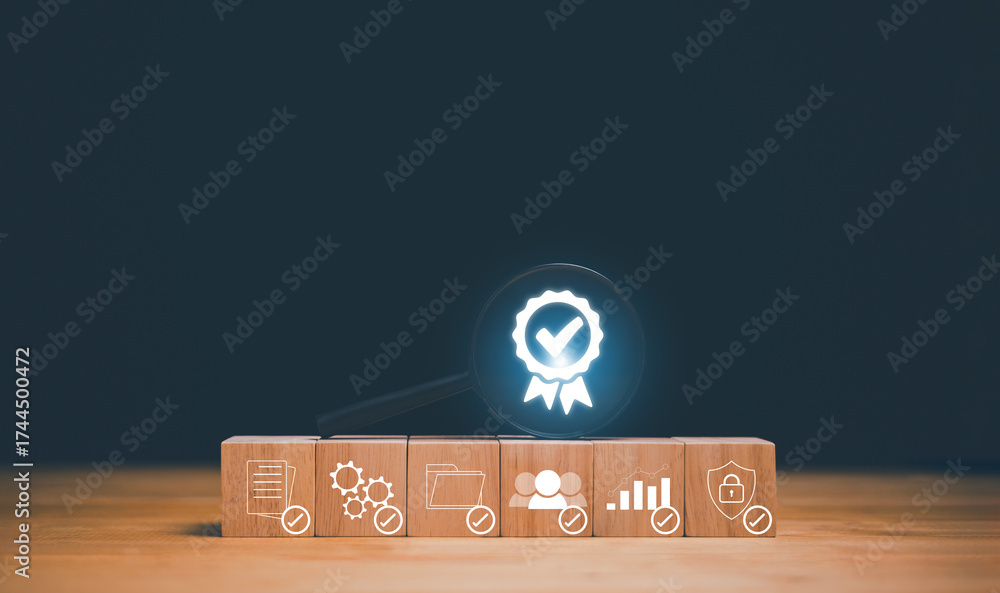 Quality assurance and certification concept. Magnifying glass focusing on check mark badge above wooden blocks with business icon. Standard approval, business quality control and process management.