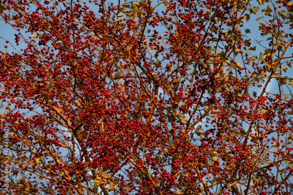 Close-up of the red berries of the hawthorn tree, which grow in abundance on the tree in autumn. Blue sky in the background.