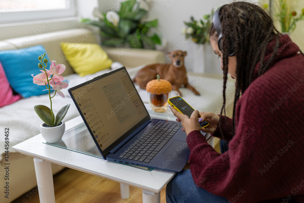 The girl creating content on computer and smartphone at home. Video blogging and internet multimedia.