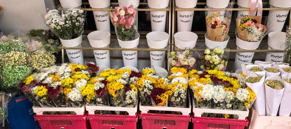 A vibrant display of fresh flowers at a flower shop, showcasing various colorful blooms.