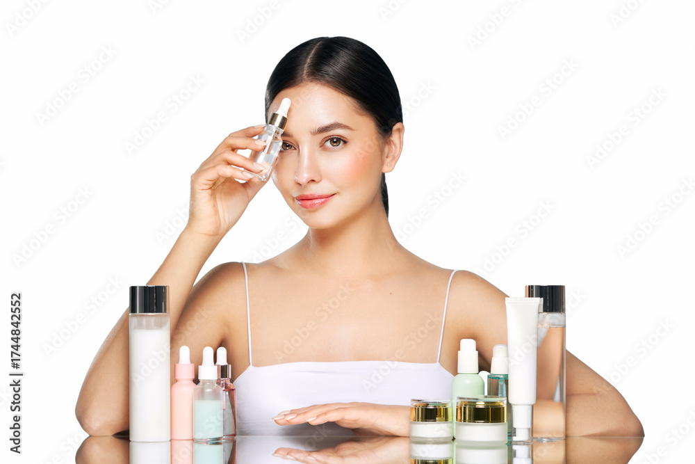 Cosmetics based on natural ingredients, scrub, tonic, body care. Production of natural cosmetics. A young woman on a light white background among jars, bottles and tubes for cosmetic procedure