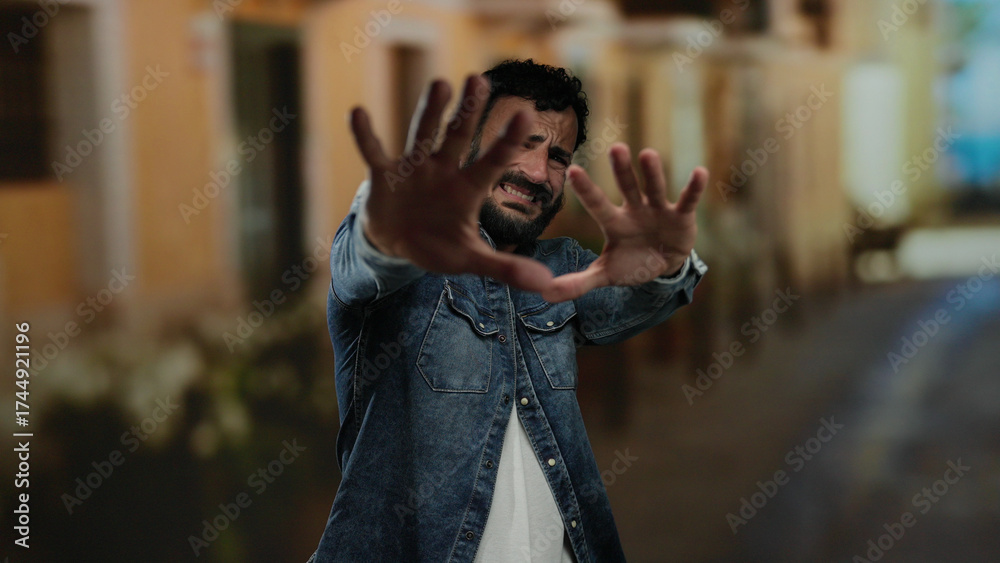 Hispanic man with beard stands outdoors on street appearing scared with hands stretched forward in defensive gesture while wearing denim shirt.