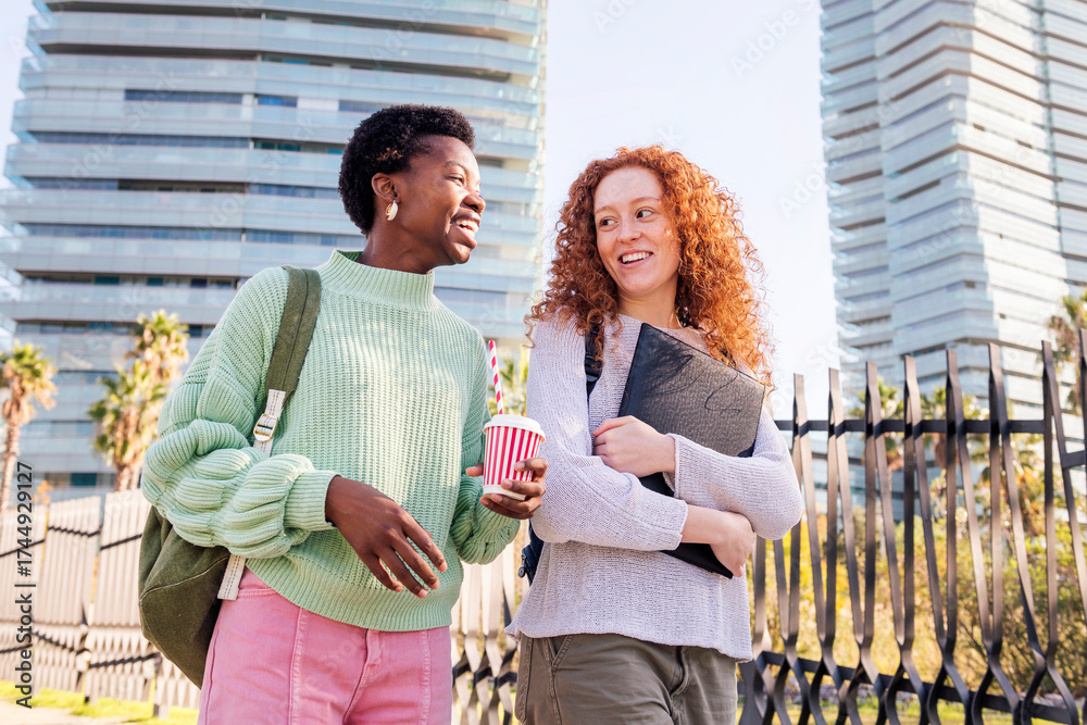two young women smiling happy while walking down a sidewalk with backpack and folder, concept of students and urban youth lifestyle
