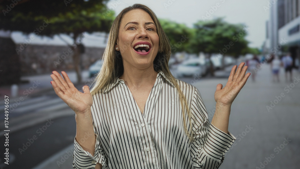 Woman raises hands on busy city street sidewalk with parked cars behind her and leafy trees overhead; spontaneous happiness.