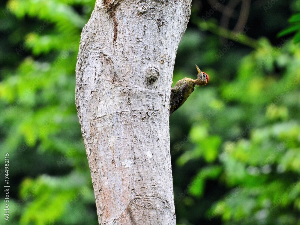 A vibrant Laced Woodpecker perched on the side of a tree trunk at Nam Nao Petchabun Thailand