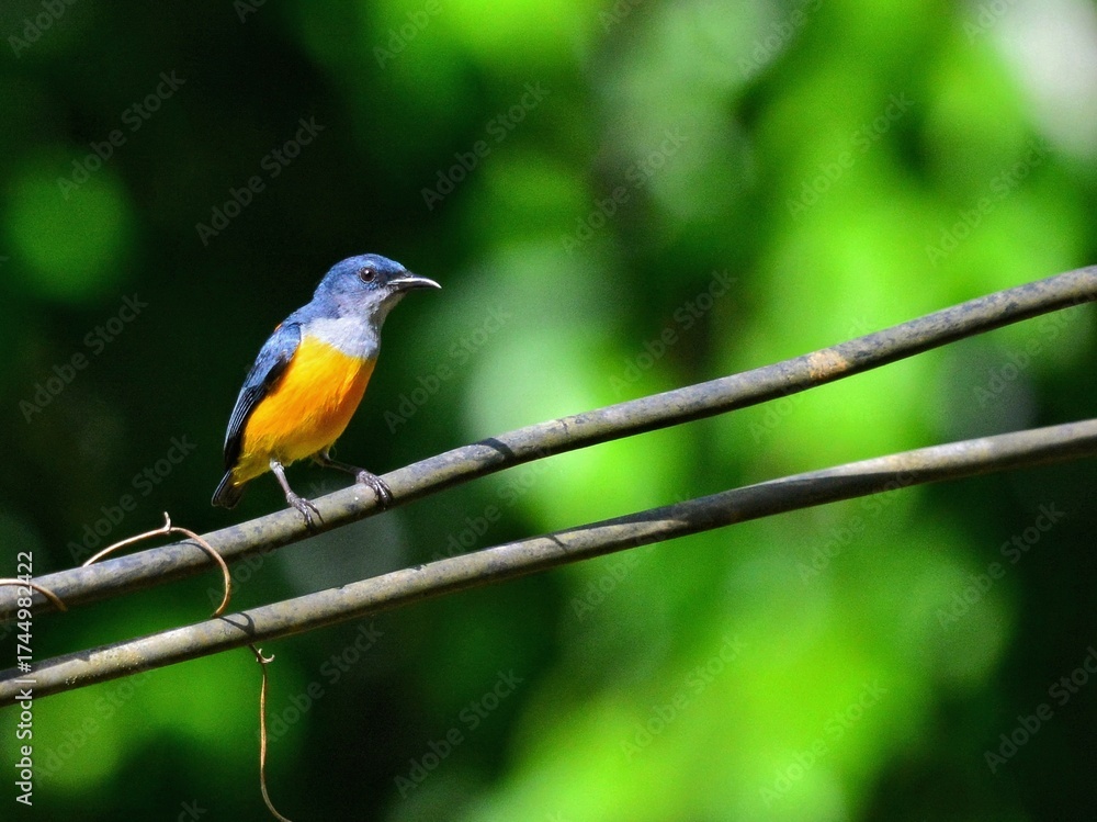 An Orange-breasted Flowerpecker perched on a thin branch, with its vibrant blue and orange plumage is a colorful contrast against the green background at Hala Bala Thailand