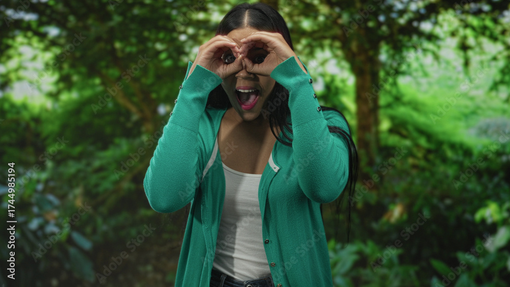 Woman makes binocular gesture with hands over eyes amid dense green forest trees; adventure curiosity.