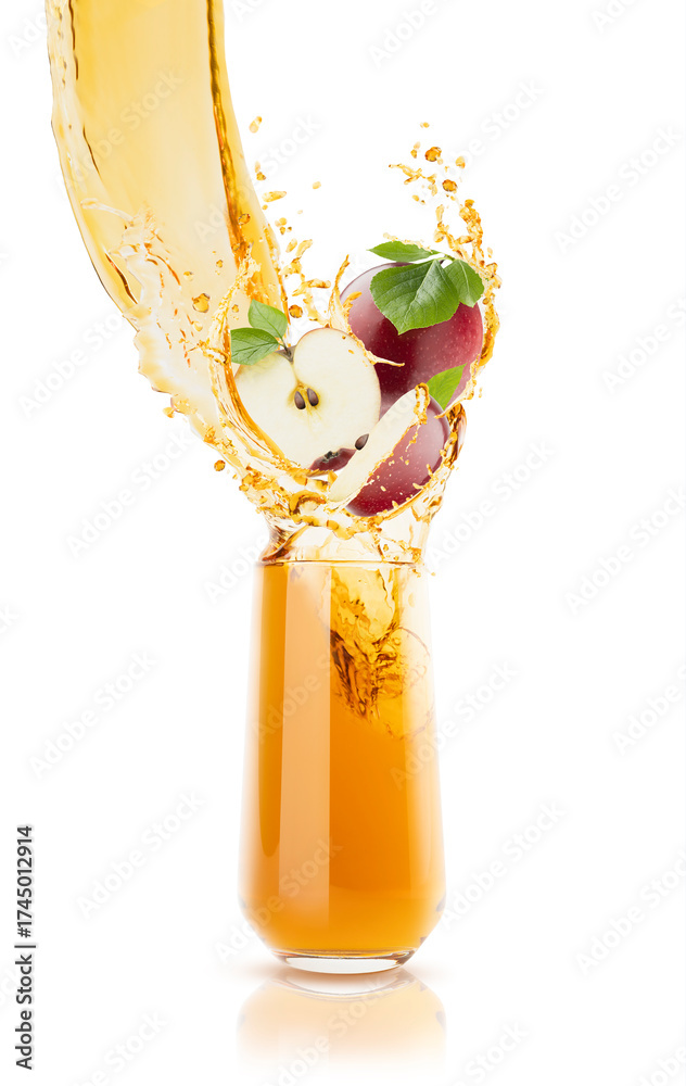 Fresh apple juice pouring in glass with flying vibrant red apple slices, green leaves, splashes of juice. Perfect for healthy drink advertising, design, flyer, card, poster. Isolated on white.