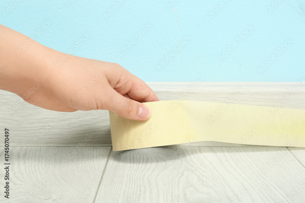 Woman applying masking tape to baseboard near blue wall, closeup