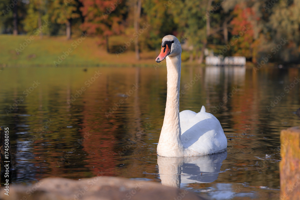 A white swan on a lake in an autumn park . Beautiful birds . Autumn park