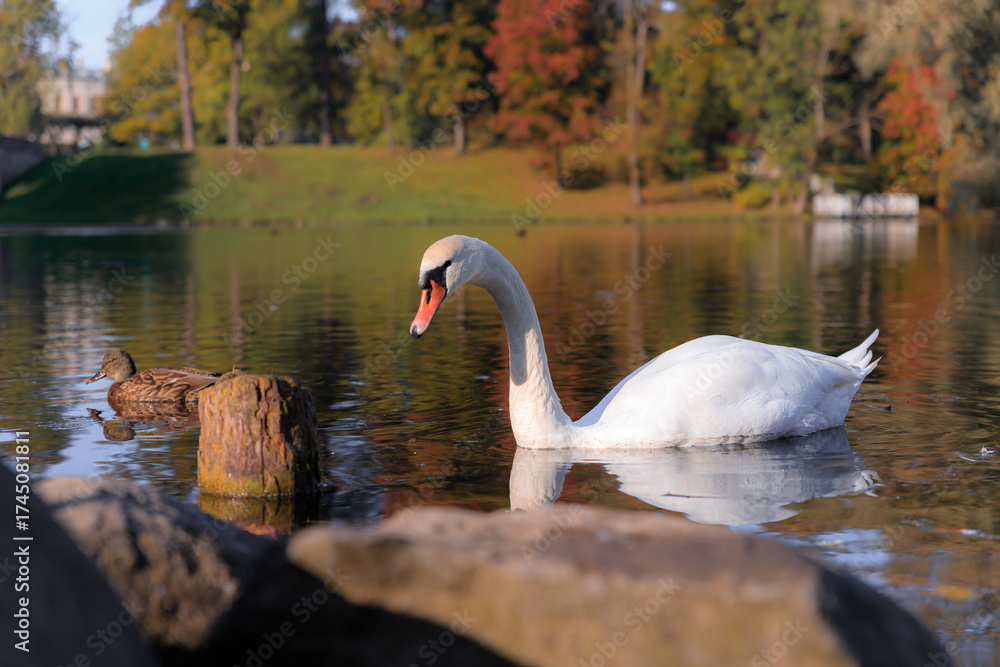 A white swan on a lake in an autumn park . Beautiful birds . Autumn park