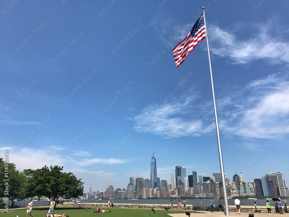 USA Flag in New York City on Ellis Island with View of Downtown Manhattan in the Background