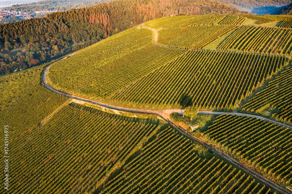 Aerial view of the vineyards near Eltville in the warm light of the early morning sunrise