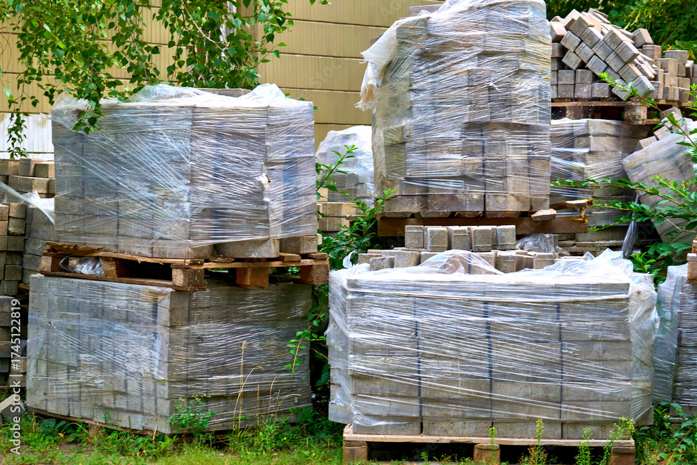 Ready to repair.Stacked paving slabs on pallets ready to be laid on road