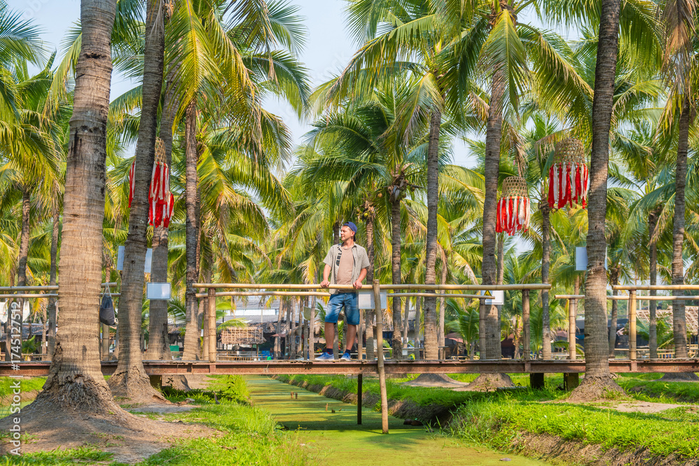 Young man standing on bamboo bridge surrounded by lush coconut palm trees on Coconut market in Chiang Mai, Thailand, enjoying nature and tropical landscape. Eco-tourism, sustainable travel