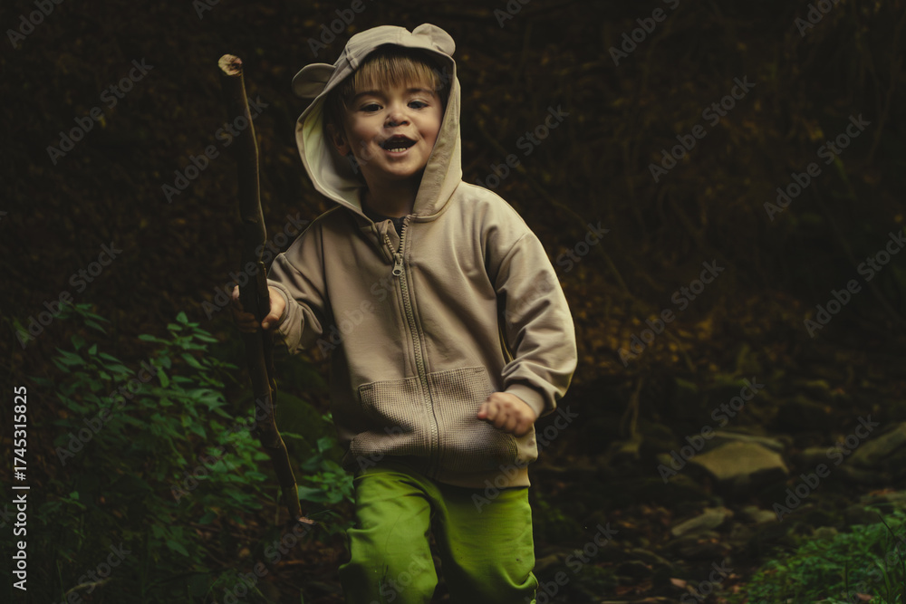 Little boy enjoys a walk in the forest and has fun