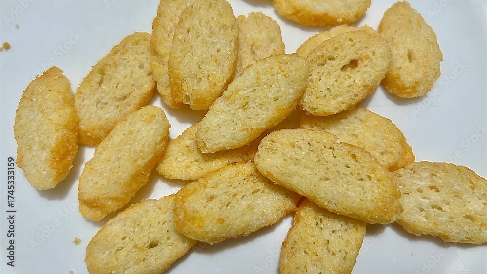 A close-up of several golden-brown toasted bread slices arranged on a white surface, showcasing their crispy texture and crunchy appearance.