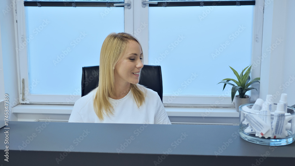 A smiling woman in a white shirt sits at a desk in a bright, modern office with a large window, potted plant, and pen holder, suggesting a professional role in healthcare or administration.
