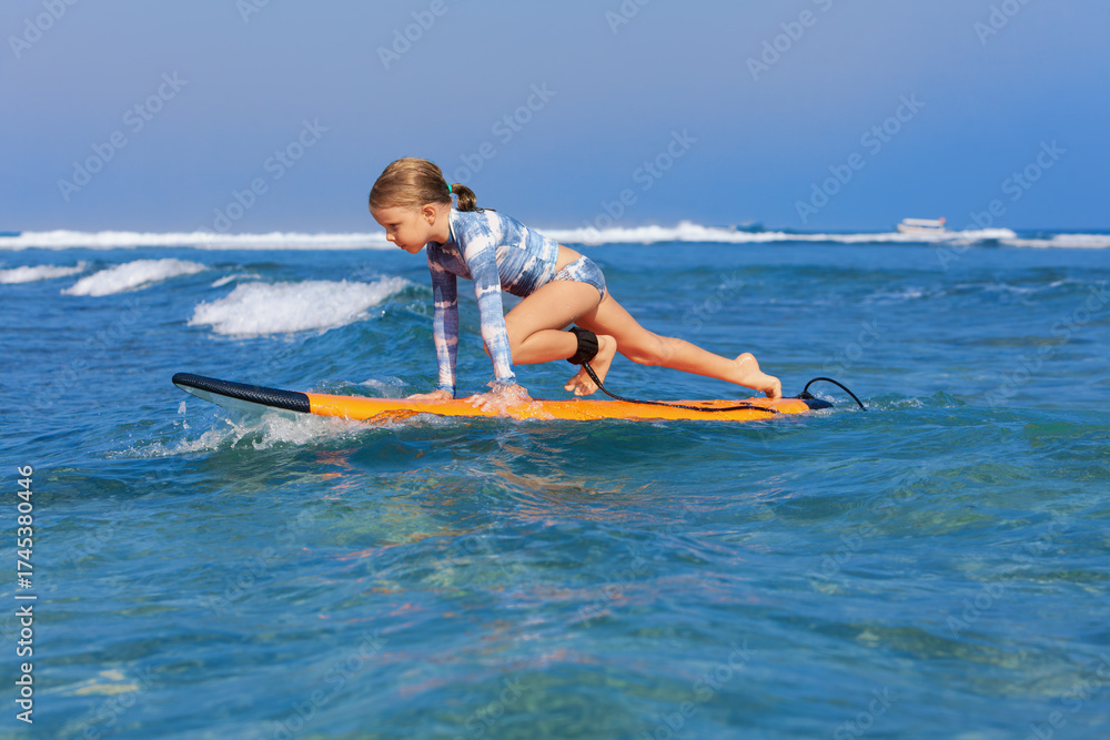 Happy young surfer girl with surfboard have fun on beach, riding on small ocean waves. Summer adventures, active families, parents and kids lifestyle, sports activities on school holiday with kids
