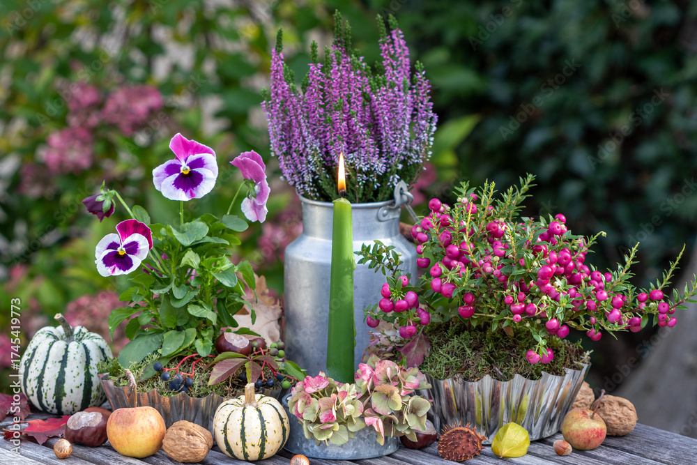 Arrangement mit Kerze, pink Torfmyrte, Stiefmütterchen und Heidekraut in vintage Töpfen und Kürbissen im Herbstgarten