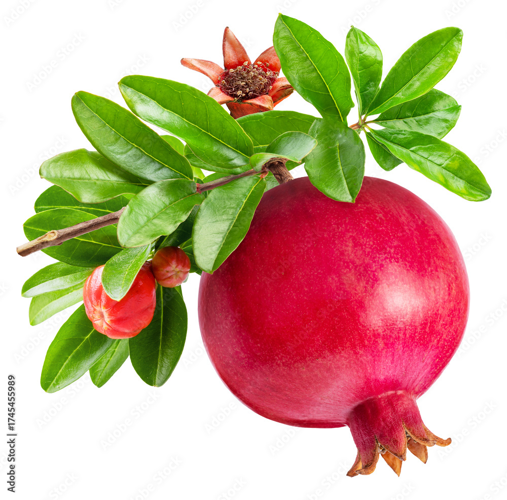 Pomegranate on a pomegranate branch isolated on a white background. Clipping path.