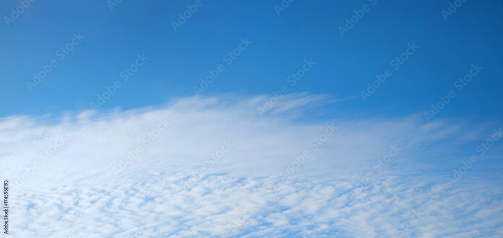 Closed cloud cover of fluffy clouds, cirrus clouds and blue sky above