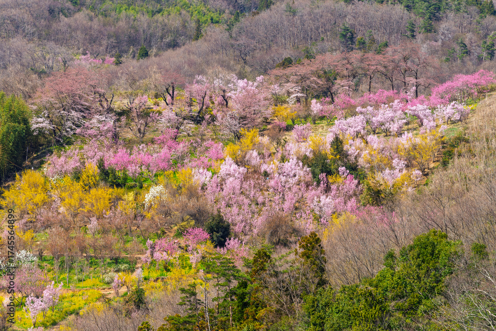 Cherry-blossom trees (Sakura) and many kinds of flowers in Hanamiyama park and Fukushima cityscape, in Fukushima, Tohoku area, Japan. The park is very famous Sakura view spot