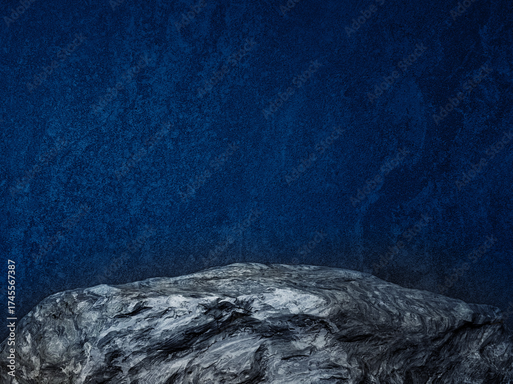 Natural Dark Grey Stone Rock Podium or Presentation Display with blue navy stone background for Product Showcase and Beauty Cosmetic Advertising. Organic, Minimalist Stone Stand.