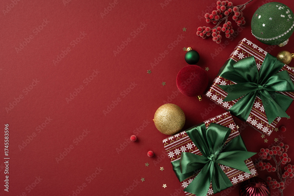 Vibrant holiday scene featuring wrapped gifts with dark green ribbons, a red backdrop, and gold ornament accents, perfect for Christmas and New Year celebration and festive greeting imagery