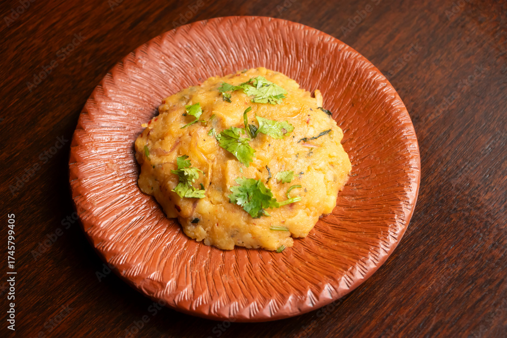 Aloo Bhorta, Spicy Mashed Potato with Mustard Oil and Coriander Rustic Plate side view of bangladeshi food