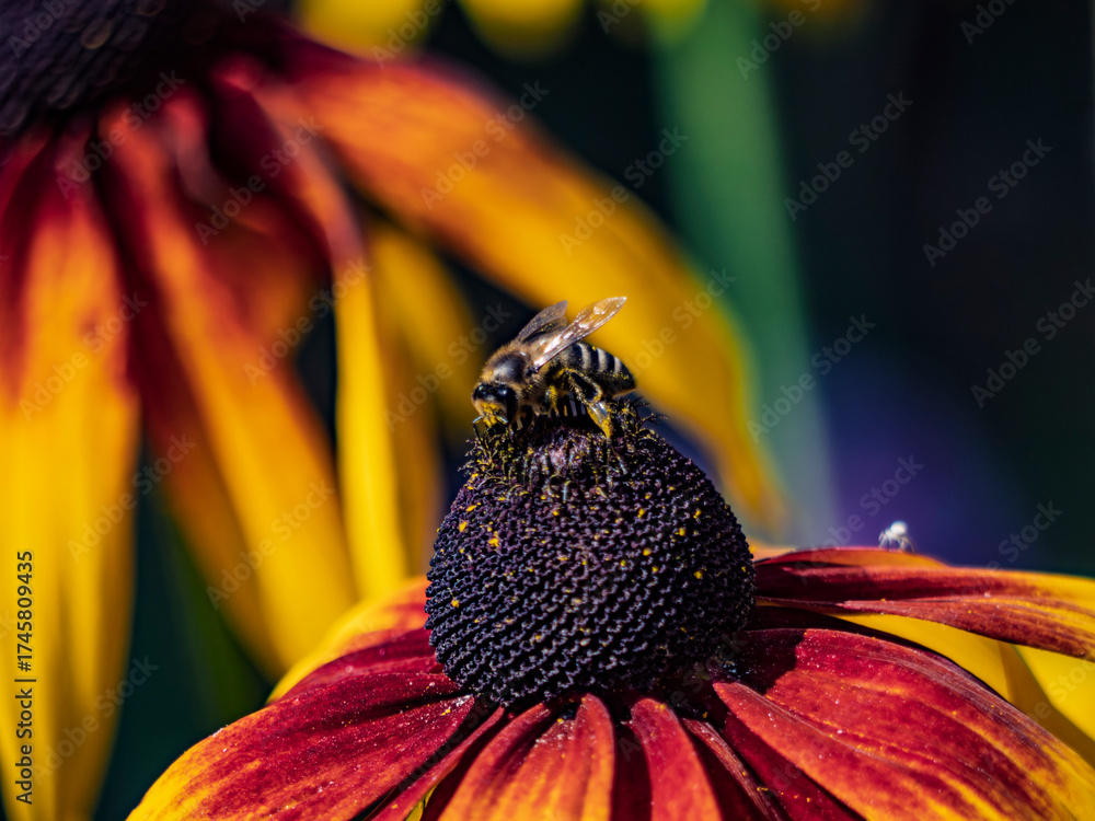 Bee On Colorful Flower Closeup: Macro Portrait Of Pollinator On Red Yellow Petals
