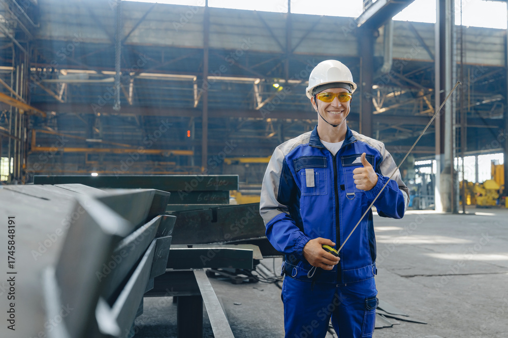 Smiling male worker in factory with safety gear and blue uniform, Technical Control Department