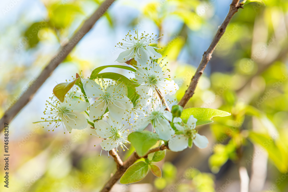 Surinam Pitanga flower (Eugenia uniflora L.). The first flowering of a Surinam pitanga tree in spring in Brazil, natural light, selective focus.