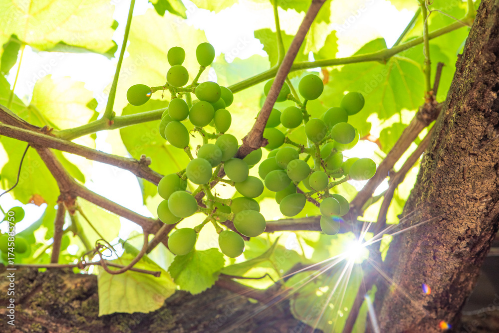 Bunch of grapes, a small bunch of grapes that have just appeared on the vine, selective focus.