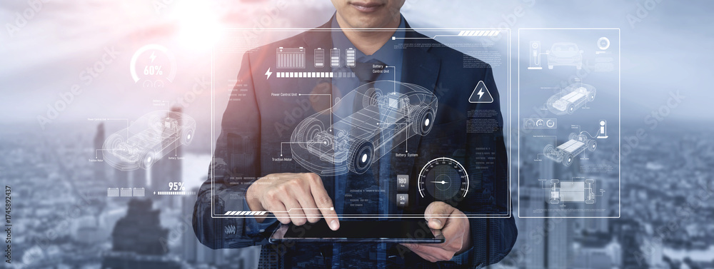 Technical layout of electric vehicle showing battery system, power control, traction motor, charging interface, and integration with renewable and smart energy sources Vouch