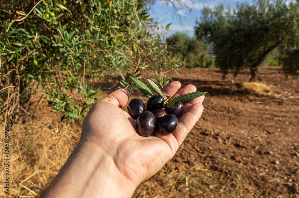 Freshly harvested olives in a hand, accompanied by green leaves and the olive grove in the background.