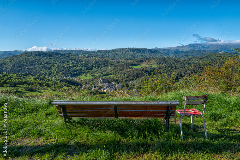 un banc et une chaise face à un panorama auvergnat sur la ville de Saint-Nectaire
