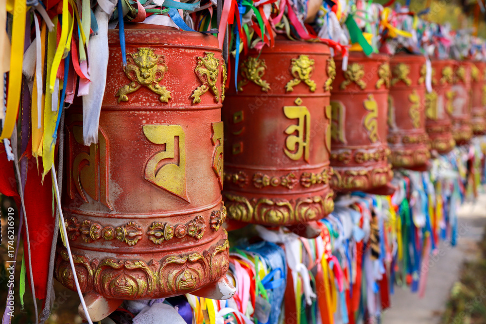 A close-up of red prayer drums khurde . An attribute of Buddhist rituals. Buryatia, Arshan, Russia.