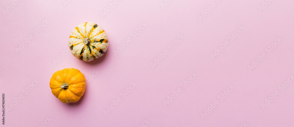 Autumn composition of little orange pumpkins on colored table background. Fall, Halloween and Thanksgiving concept. Autumn flat lay photography. Top view vith copy space