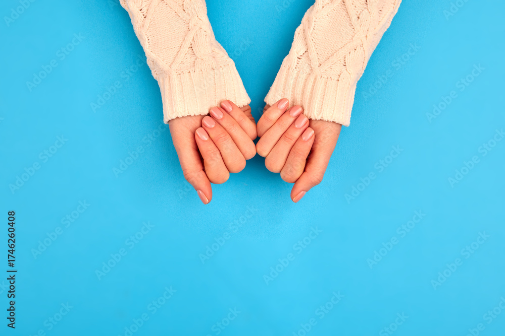 Woman's hands wearing a cozy cream knitted sweater displaying perfectly manicured nude nails on a vibrant blue background, creating a comforting winter beauty concept