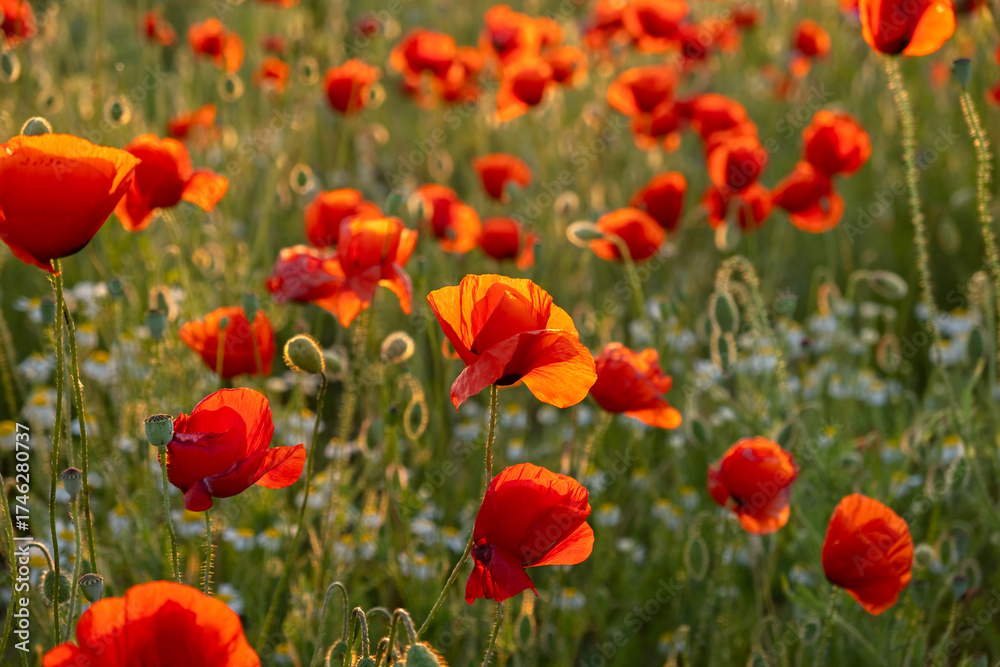 A poppy field at sunset. Bright scarlet poppies and white daisy flowers in close-up. Warm atmospheric summer background. soft focus, blurry movement. The concept of summer, warm evenings. Postcard