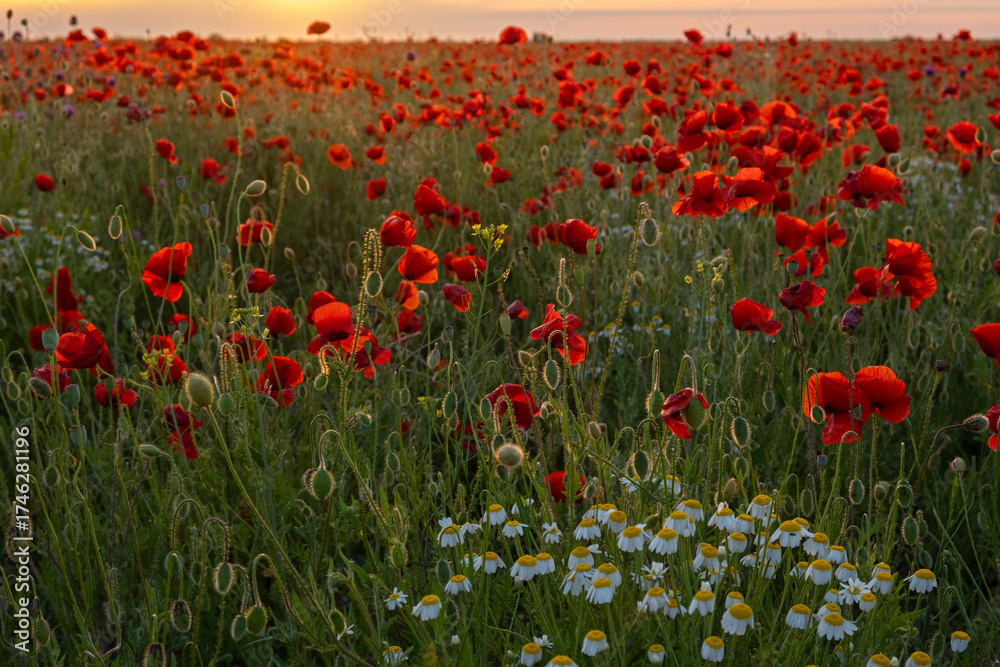 A poppy field at sunset. Bright scarlet poppies and white daisy flowers in close-up. Warm atmospheric summer background. soft focus, blurry movement. The concept of summer, warm evenings. Postcard
