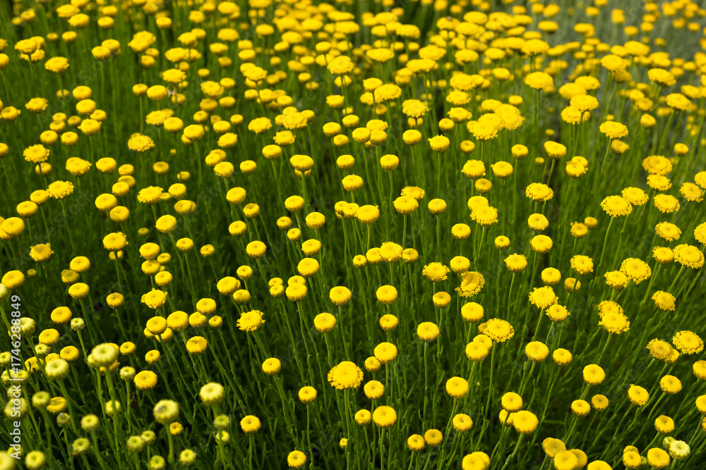 A shrub with yellow Santolina flowers. Close-up of the flowers in the flower bed bloomed. Bright floral natural background for the design. The concept of a summer mood. Decorative garden flowers
